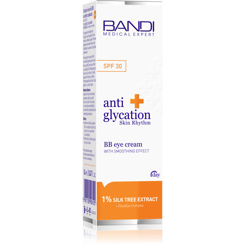 Anti Glycation Skin Rhythm SPF 30 este o cremă BB netezitoare pentru zona ochilor de la BANDI Cosmetics, un brand polonez de încredere cu aproape 40 de ani de experiență. Acest produs inovator combină protecția UV cu îngrijirea inteligentă a pielii, sincronizată cu ritmul circadian natural al pielii. Îmbogățit cu 1% extract din arbore de mătase și complexul GlowEye, reduce vizibil pungile, cearcănele și semnele de oboseală din jurul ochilor.